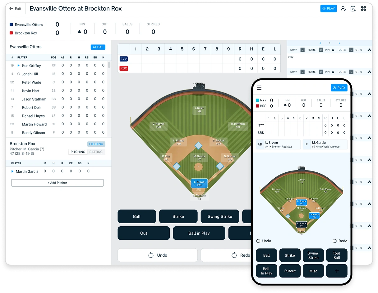 From pre‑game checks to pitch‑by‑pitch input, iScore guides scorers through every step so games run smoother and data stays consistent. Intuitive lineup management and real‑time state tracking mean fewer errors and faster workflows for scorers at every level.