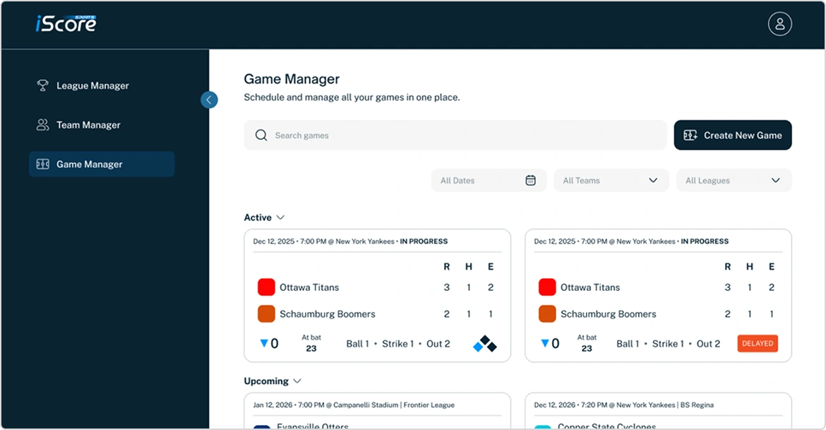 iScore™ centralizes everything — teams, divisions, rosters, schedules, permissions — so league operations finally run smoothly. Build schedules, assign scorers, and manage access without juggling spreadsheets or disconnected tools.